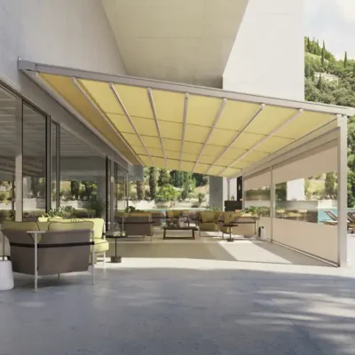 - Vertikale Verschattungen oder Seitenmarkisen als Sicht- und Windschutz